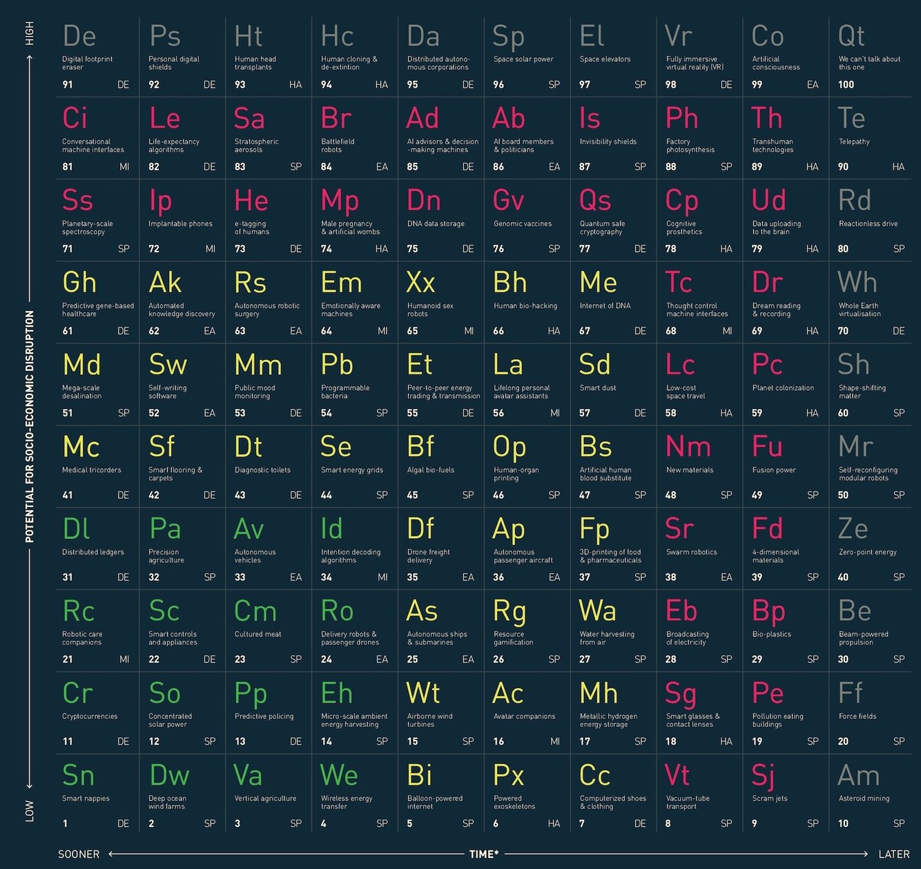 Вони створили таблицю технологій, взявши натхнення з періодичної таблиці хімічних елементів. Вона містить 100 нововведень, починаючи від добробуту і повсякденності, до шокуючих і потенційно страшних.