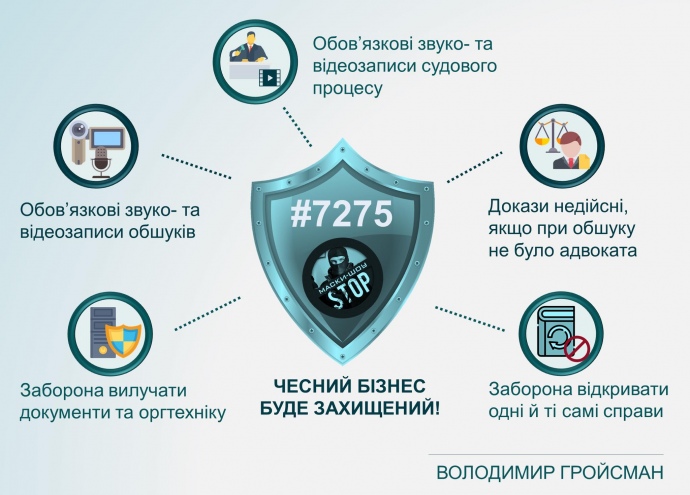 Він додав, що за новим законом, якщо під час обшуків були вилучені документи підприємців, техніка та інші матеріали без присутності адвоката, то вилучені матеріали не зможуть надалі використовуватися стороною обвинувачення. Крім того, за його словами, тепер обвинувачі повинні доводити необхідність обшуків і не зможуть іх проводити без відповідної ухвали суду, керуючись лише власними мотивами. Також змінюються строки проваджень та можливість їх оскаржувати та багато іншого.