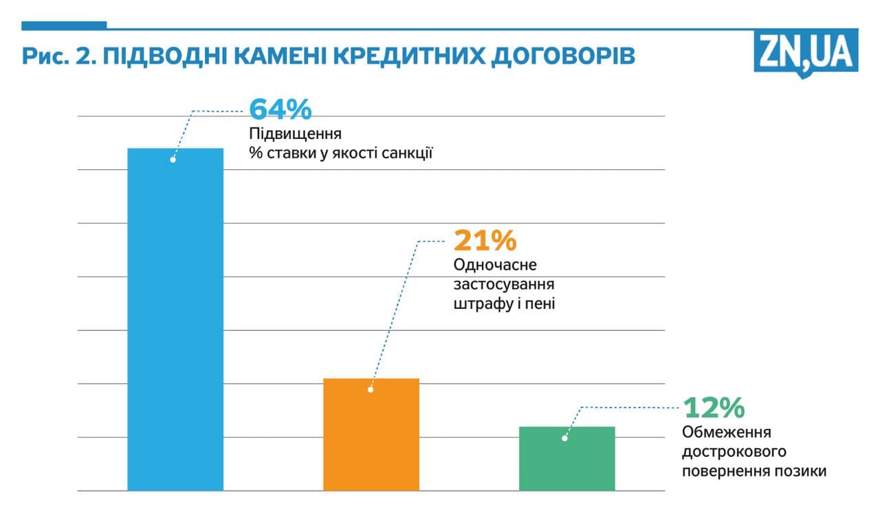 Крім цього, попри законодавчі вимоги, кожні два із трьох кредитних договорів містять пункти про підвищення відсоткової ставки у разі невиконання зобов’язань за договором. Одночасне застосування штрафів і пені за одне й те саме порушення міститься у кожному п’ятому договорі. І досі існує частина тих компаній, які обмежують права позичальників повернути кредит достроково, і їх не так мало — 12% (див. рис. 2).