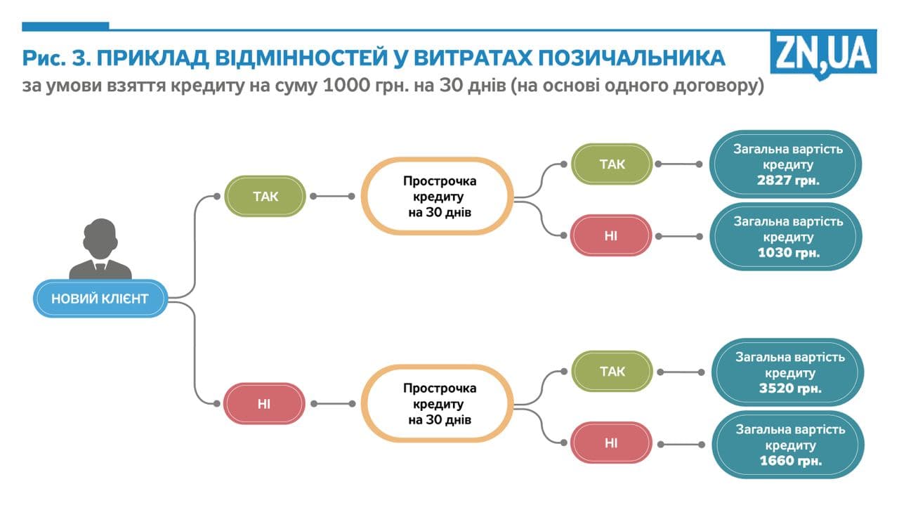 Якщо ви повернулися, ви у пастці. Звертаючись по мікрокредит вперше, ви в більшості випадків отримаєте його на кращих умовах, за зниженою процентною ставкою та «акційними» пропозиціями. Наприклад, ваша річна ставка може бути не 500%, а 0%, от прямо так і прописують в угоді — «0% за кредитом». Але якщо вибратися зі скрути швидко не вдалося і ви повернулися по наступну позику, проценти для вас будуть гіршими, а «акції» перетворяться на «санкції» (див. рис. 3).