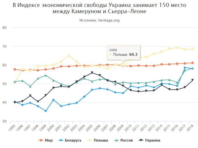 У рейтингу Індексу економічної свободи (Index of Economic Freedom) позиції Києва значно гірші. 150 місце у 2018 році — між Камеруном і Сьєрра-Леоне. Україна — серед країн, де в основному невільна економіка. Позитивний прогрес мізерний.